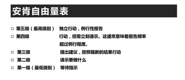 按照安肯自由量表,从等待指示到请求指示,再到提出方案、甚至独立行动,需要你对事情进行分类,并不断提高自己的办事的等级。