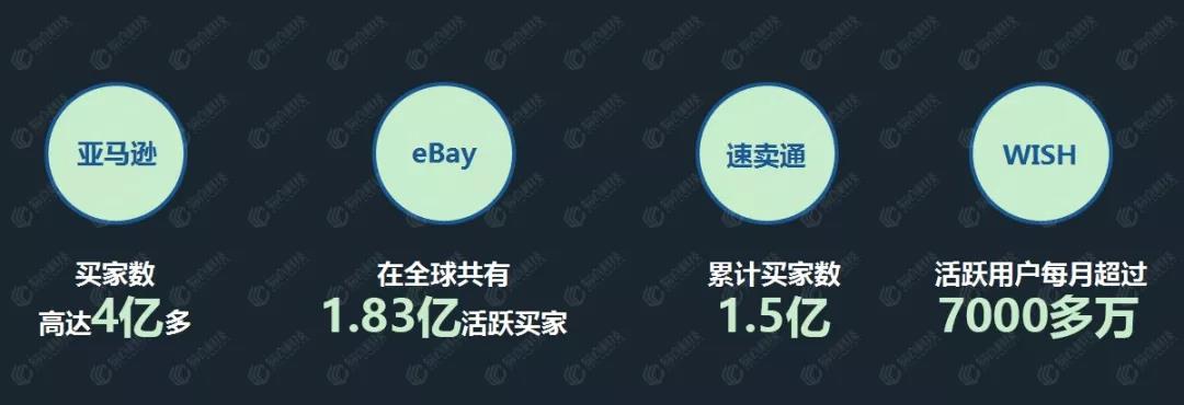 时至今日,全球已经出现了200多个电商平台,我们以四家平台为例,亚马逊、eBay、速卖通、Wish,来看看平台的滋养之力,以下是四家平台的买家数,正是这些买家买出了中国跨境出口的繁荣。