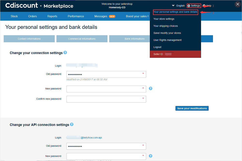 Cdiscount 用户名:API账号,查看方法:进入Cdiscount店铺后台 →MANAGE YOUR ACCOUNT→Your personal settings and bank details→Change your API connection settings→Your login: xxx,xxx 即是