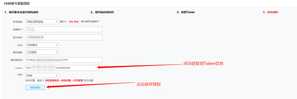 第六步:获取到Token之后点击保存授权,就完成了1688采购的授权