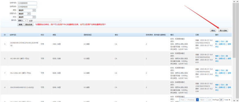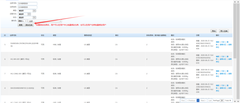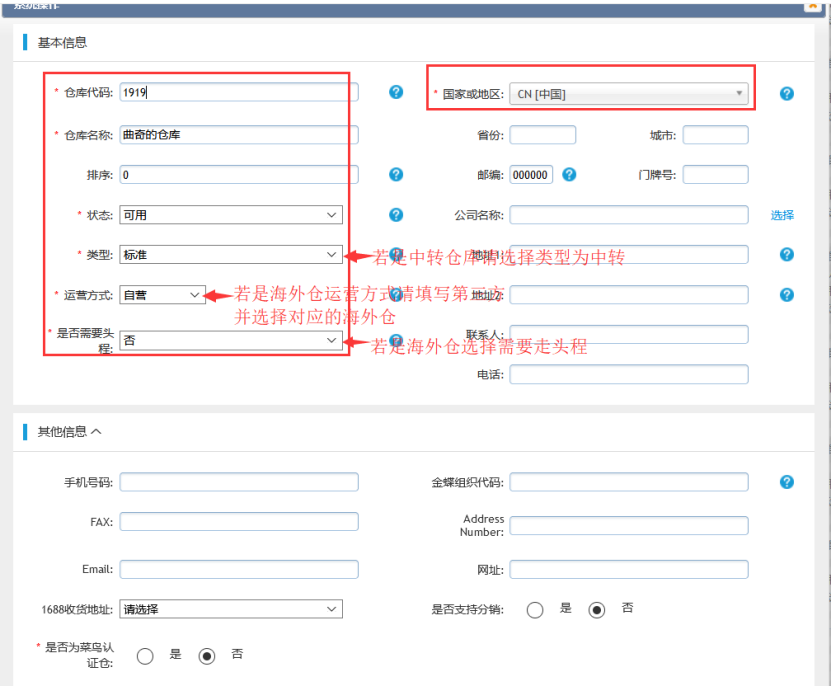 4、仓库类型:每一个仓库的类型,标准仓还是中转仓。其中,标准仓是可以正常出货的仓库(用于派发订单出库),而中转仓是专门用于中转集货发海外仓的仓库,在系统的头程流程当中,头程发货仓库只能为中转仓。必填。