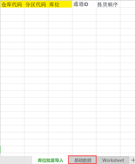 注:模板内标黄的是必填项,仓库代码,分区代码等基础数据在基础数据表格内查看,数据填写完后上传到系统中。
