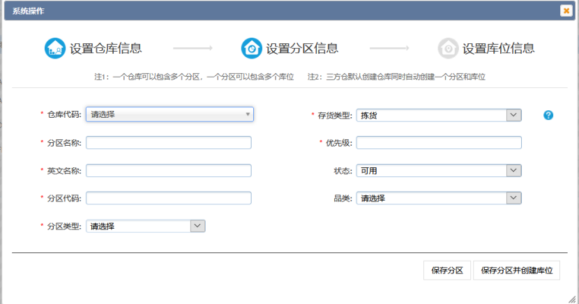 说明:打※的为必填项,要先维护好仓库之后才能维护分区。