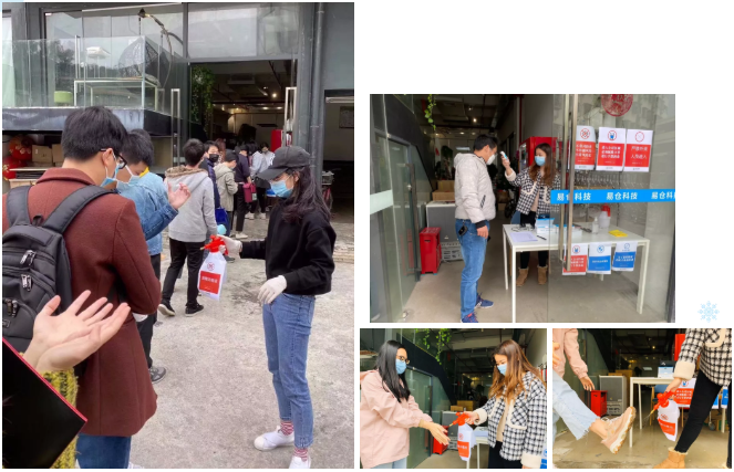 我们做了什么准备和措施呢?嘿嘿,我们推出了“五大贴心行动+一个硬核措施”,进出门消毒、测体温、发口罩一一安排,接送班车和代采购蔬菜肉类件件齐全,远程办公+公司办公双管齐下,对疫情把控非常严格的同时,也为易仓小伙伴们提供了最暖心最贴心的后援支持。