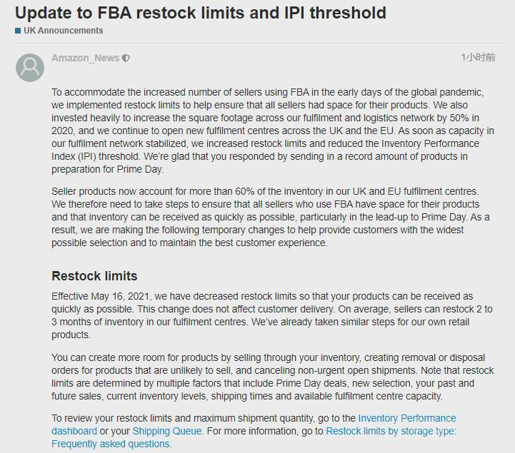 一方面更新了补货限制政策:自2021年5月16日起,亚马逊官方表示已经降低了库存限制,卖家可以在履行中心补货2-3个月。但实际上,卖家只有满足特定条件,才可享受降低补货限制的政策。