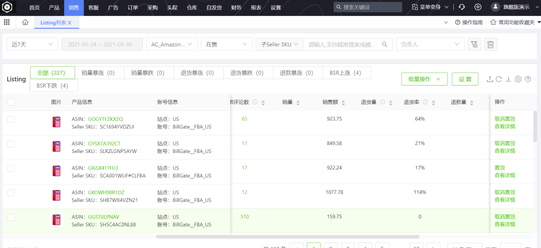 但实际操作过程中,卖家想登录亚马逊后台查看数据,需要来回切换界面,比较麻烦且数据容易出错。这个时候利用易仓ERP的一屏展示多维度数据,通过Listing列表,清晰看到每个Asin展示情况,销售、订单数、退款率、可售天数、广告订单量等数据信息,还可看到对手Listing对比分析,有的放矢地进行策略性打法,彻底解决卖家看数据难的问题。