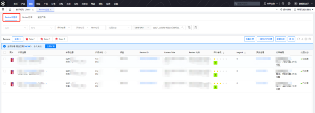 或者,你也可以通过易仓ERP评论管理功能,及时获取所有店铺的中差评信息,并及时做出回应和处理。