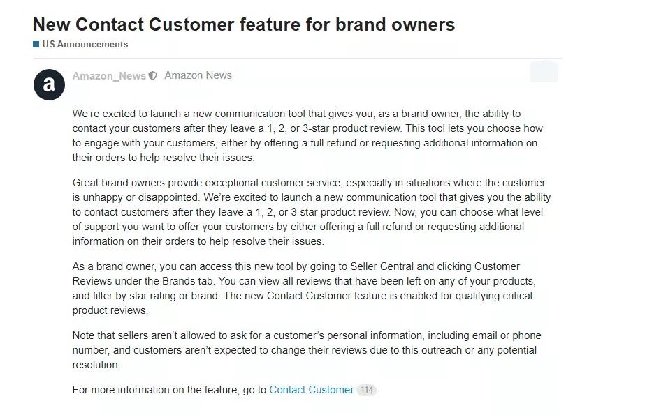 近期,亚马逊美国站发布公告称:推出了一种卖家与买家沟通的新工具,即允许品牌卖家与留下1、2或3星产品评论的消费者联系。这意味着,卖家可以通过亚马逊官方渠道联系买家处理差评了。