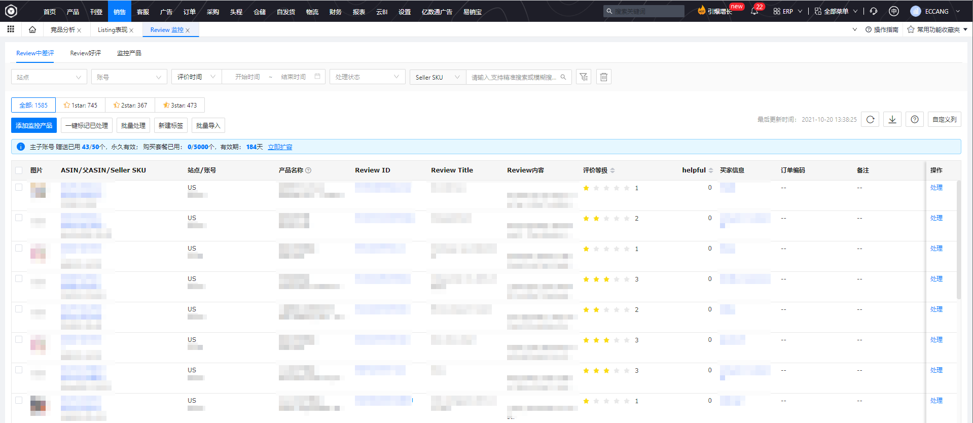 此次,ECCANG ERP新推出的评论质量分析功能,一键设置即可自动获取您的Review进行识别,并打上相关标签。之后,您可直接在产品列表查看不同ASIN的问题。