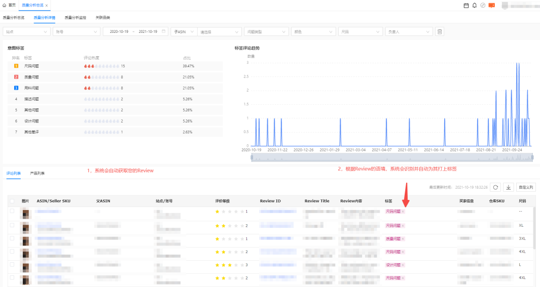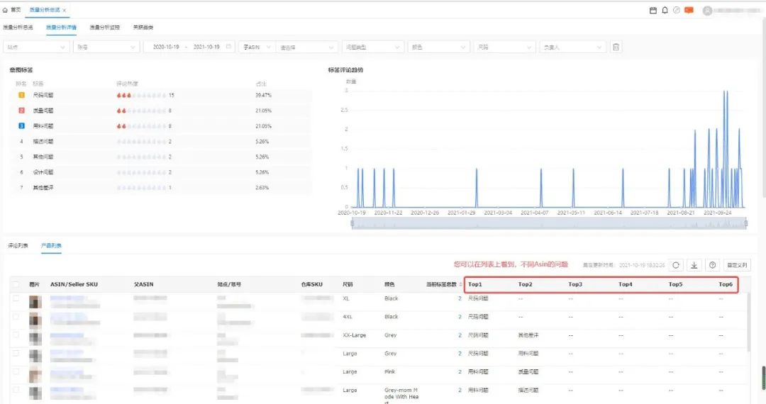 一键设置、系统自动分析,不同ASIN问题一目了然,助您智能分析评论内容,助力产品质量提升。(目前该功能只支持服装品类,后续将开发更多品类,敬请期待!)